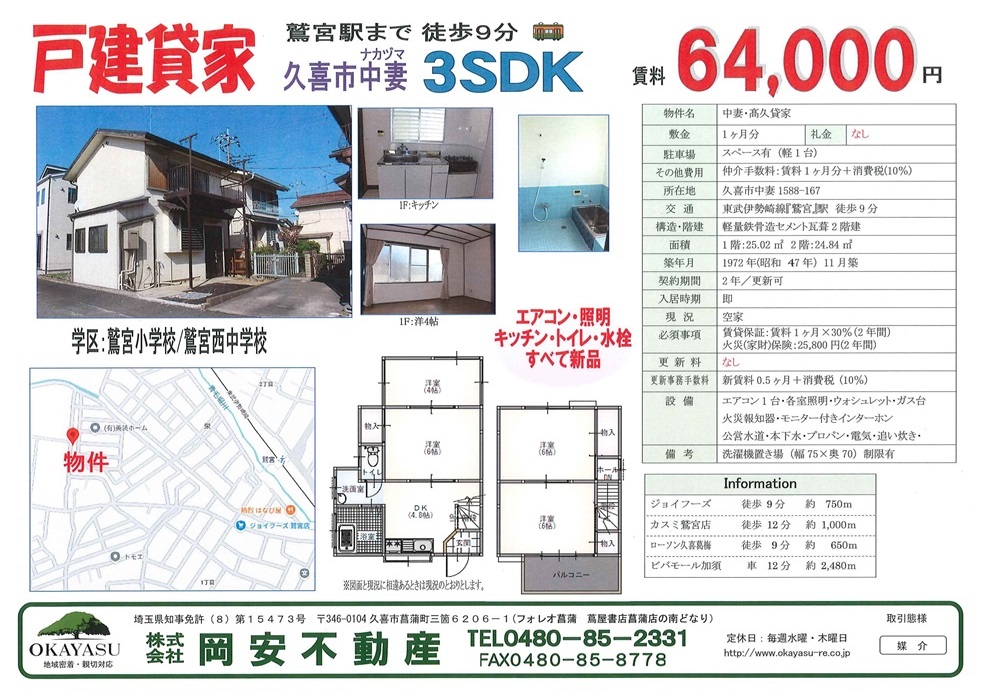 戸建貸家 久喜市中妻 3SDK 2026.04.10 賃貸一覧 賃料 6.4万円 共益費 - 敷金・礼金 1ヶ月/なし 入居時期 即 外観 キッチン 資料 交通 ◎東武伊勢崎線「鷲宮」駅 徒歩 9分 所在地 久喜市中妻1588-167 地図 間取り 3SDK(洋6×3/DK4.8/S4) 占有面積 1F:25.02㎡ 2F:24.84㎡延49.86㎡(15.08坪) 契約期間 2年 学区 鷲宮小学校/鷲宮西中学校 物件の設備・建物情報 設備 エアコン1台・各部屋照明有・追い炊き機能あり・モニター付きインターホン・公営水道・本下水・プロパン・電気 建物構造 軽量鉄骨造セメント瓦葺2階建 築年月 1972年/11月(昭和47年) 駐車場 1台(軽自動車) その他初期費用 仲介手数料(賃料1ヶ月分+10%消費税) 必須事項 火災(家財)保険加入賃貸保証加入 周辺情報 ジョイフーズ/徒歩9分 カスミ鷲宮店/徒歩12分ビバモール加須/車12分 ローソン久喜葛梅/徒歩9分 コメント: 0 中古マンション 久喜市桜田 3LDK 関連記事 貸地 菖蒲町北中曽根 1424.30㎡(430.85坪) 戸建貸家 久喜市菖蒲町新堀 5LDK 菖蒲町菖蒲 3DK シティーハイムコカツB棟 加須市鴻茎 2DK ベルコーポ 菖蒲町菖蒲 3DK ストロベリーファーム 加須市花崎 ロフト付ワンルーム モア・クレスト 貸地 菖蒲町新堀 476㎡(143.99坪) コメント コメント ( 0 ) トラックバック ( 0 ) この記事へのコメントはありません。 この記事へのトラックバックはありません。 トラックバック URL 返信をキャンセルする。 名前 E-MAIL ※ 公開されません URL