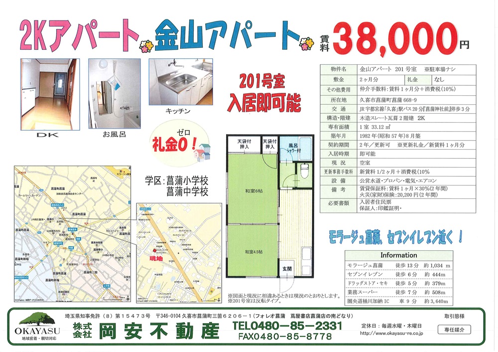 久喜市菖蒲 2K 金山アパート 2025.11.23 賃貸一覧 賃料 3.8万円 共益費 - 敷金・礼金 1ヶ月/なし 入居時期 即可能 外観 駐輪場 資料 交通 ◎JR宇都宮線『久喜』駅バス20分「菖蒲神社前」停歩3分 所在地 埼玉県久喜市菖蒲町菖蒲668-9 地図 間取り 2K(和4.5・6.0) 占有面積 33.12㎡ 建物階 2階建/ 2階(201号室) 築年月 1982年8月築(昭和57年) 契約期間 2年 学区 菖蒲小学校/菖蒲中学校 物件の設備・建物情報 設備 プロパンガス・エアコン・ゴミ集積場・地デジ対応・室内洗濯機置場・・給湯(ガス)・郵便受け 構造・種別 木造2階建て/アパート 総戸数 4戸 駐車場 無 その他初期費用 仲介手数料(賃料1ヶ月分+10%消費税) 条件等 火災保険加入(20,200円/2年間)・ペット不可賃貸保証/賃料1ヶ月分×30%(2年間) ※最低12,000円 周辺情報 モラージュ菖蒲 徒歩13分/セブンイレブン 徒歩6分業務スーパー 徒歩7分 / ドラックストア・セキ 徒歩5分 コメント: 0 加須市鴻茎 2DK ベルコーポ 菖蒲町新堀 店舗併用住宅 125.91㎡(38.08坪) 関連記事 貸家 久喜市菖蒲町下栢間 4LDK 貸家 久喜市菖蒲町菖蒲 4LDK 伊奈町小針内宿 シャイニィベル 1K 加須市鴻茎 2DK ベルコーポ 貸家 久喜市鷲宮 2K コメント コメント ( 0 ) トラックバック ( 0 ) この記事へのコメントはありません。 この記事へのトラックバックはありません。 トラックバック URL 返信をキャンセルする。 名前 E-MAIL ※ 公開されません URL