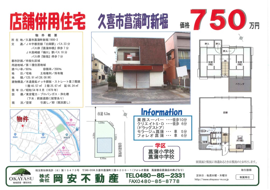 菖蒲町新堀 店舗併用住宅 125.91㎡(38.08坪) 2025.12.16 売買一覧 価格 750万円 都市計画 市街化区域 用途地域 第一種住居地域 土地面積 125.91㎡(38.08坪) 外観 1階店舗 1階店舗内 1階店舗 キッチン 間取図 資料 交通 ◎JR宇都宮線 白岡駅 バス23分 バス停『菖蒲仲橋』徒歩7分◎JR高崎線 桶川駅 バス18分 『新堀』バス停 停歩7分 所在地 埼玉県久喜市菖蒲町新堀1900-3 地図 建ぺい率 地 目 60% 宅地 容積率 引渡し 200% 即(現況渡し) 物件の設備・建物情報 設備 プロパン、電気、公営水道、浄化槽(前面道路に配管あり) 周辺情報 学 区 業務スーパー 徒歩5分/クリエイト(ドラッグストア) 徒歩6分/モラージュ菖蒲 車5分/フォレオ菖蒲 車6分 菖蒲小学校/菖蒲中学校 コメント: 0 久喜市菖蒲 2K 金山アパート 関連記事 菖蒲町菖蒲 中古住宅 225.19㎡(68.12坪) 加須市騎西 売地 61.04坪 久喜市菖蒲町菖蒲 売地 36.71坪 久喜市菖蒲 売地 475.94㎡(143.97坪) 久喜市除堀 売地(古家あり) 248.04㎡(75.03坪) 久喜市菖蒲町菖蒲 売地 148.93坪 加須市南大桑 売地(更地渡し) 241.19㎡(72.95坪) ※建築条件付き 菖蒲町菖蒲 売地 55.01坪 コメント コメント ( 0 ) トラックバック ( 0 ) この記事へのコメントはありません。 この記事へのトラックバックはありません。 トラックバック URL 返信をキャンセルする。 名前 E-MAIL ※ 公開されません URL