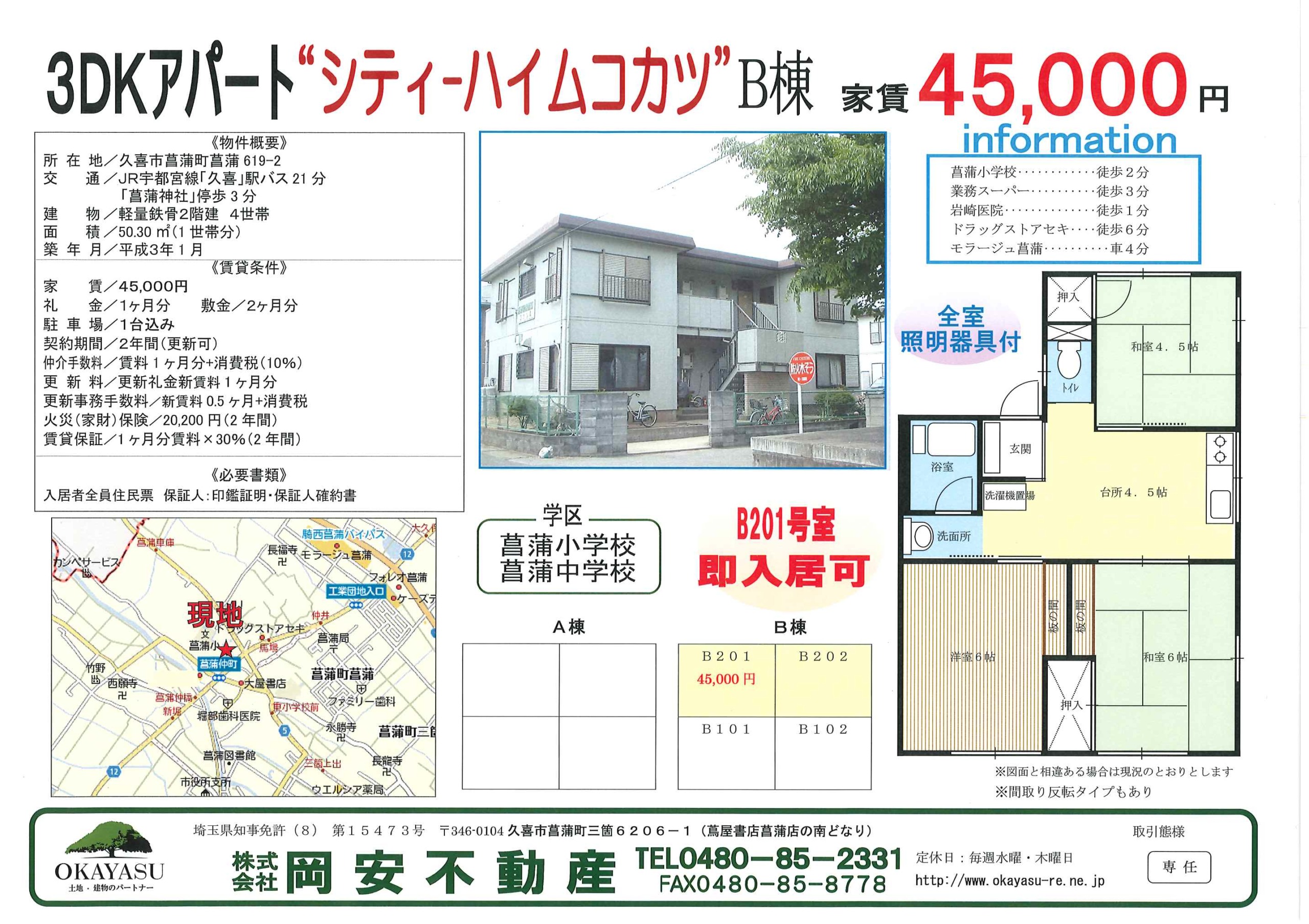 菖蒲町菖蒲 3DK シティーハイムコカツB棟 2026.02.22 賃貸一覧 賃料 4.5万円 共益費 - 敷金・礼金 2ヶ月/1ヶ月 入居時期 即可能 外観 間取り 資料 交通 ◎JR宇都宮線『久喜』駅からバス21分「菖蒲神社」停歩3分 所在地 埼玉県久喜市菖蒲町菖蒲619-2 地図 間取り 3DK(和6.0×1、和4.5×1、洋6×1) 占有面積 50.30㎡ 建物階 2階建/ 2階(201号室) 築年月 1991年築(平成3年) 契約期間 2年 学区 菖蒲小学校・菖蒲中学校 物件の設備・建物情報 設備 プロパンガス・バストイレ別・室内洗濯機置場・照明器具 構造・種別 軽量鉄骨造2階建て/アパート 総戸数 4戸 駐車場 1台無料 その他初期費用 仲介手数料(賃料1ヶ月分+10%消費税) 条件等 火災保険加入(20,200円/2年間)賃貸保証/賃料1ヶ月分×30%(2年間) 周辺情報 菖蒲小学校 徒歩2分、業務スーパー 徒歩3分、ドラッグストアセキ 徒歩6分モラージュ菖蒲 車4分 コメント: 0 菖蒲町菖蒲 2DK グリーンハイツサイド 貸家 久喜市菖蒲町菖蒲 4DK 関連記事 貸家 久喜市菖蒲町菖蒲 4DK 菖蒲町菖蒲 2DK グリーンハイツサイド 加須市鴻茎 2DK ベルコーポ コメント コメント ( 0 ) トラックバック ( 0 ) この記事へのコメントはありません。 この記事へのトラックバックはありません。 トラックバック URL 返信をキャンセルする。 名前 E-MAIL ※ 公開されません URL