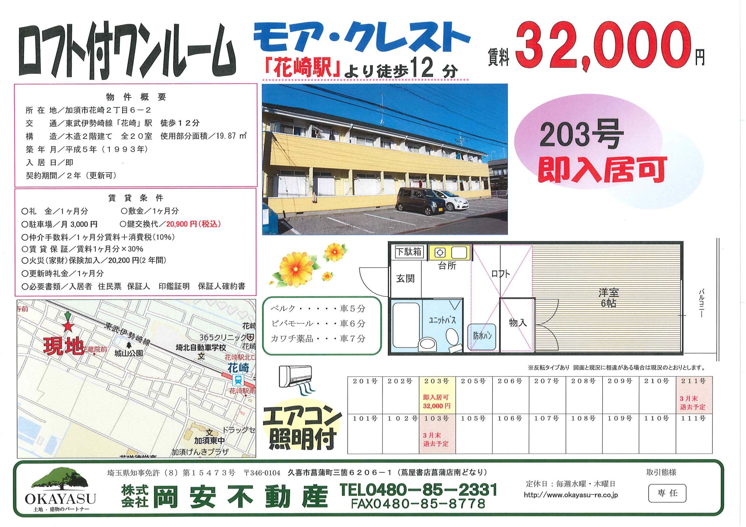加須市花崎 ロフト付ワンルーム モア・クレスト 2026.03.17 賃貸一覧 賃料 3.2万円 共益費 - 敷金・礼金 1ヶ月/1ヶ月 入居時期 即可能 外観 間取り 資料 交通 ◎東武伊勢崎線『花崎』駅から徒歩12分 所在地 埼玉県加須市花崎2-6-2 地図 間取り 1K(洋6.0×1) ※ロフト付 占有面積 19.87㎡ 建物階 2階建/ 2階(203号室) 築年月 1993年築(平成5年) 契約期間 2年 学区 花崎北小学校・加須東中学校 物件の設備・建物情報 設備 ロフト・エアコン・照明・室内洗濯機置場 構造・種別 木造2階建て/アパート 総戸数 20戸 駐車場 月3,000円 その他初期費用 鍵交換代 20,900円(税込)仲介手数料(賃料1ヶ月分+10%消費税) 条件等 火災保険加入(20,200円/2年間)賃貸保証/賃料1ヶ月分×30%(2年間) 周辺情報 ベルク 車5分・ビバモール 車6分・カワチ薬品 車7分 コメント: 0 貸地 菖蒲町北中曽根 1424.30㎡(430.85坪) 関連記事 加須市鴻茎 2DK ベルコーポ 菖蒲町菖蒲 3DK シティーハイムコカツB棟 貸地 菖蒲町北中曽根 1424.30㎡(430.85坪) 貸地 菖蒲町新堀 476㎡(143.99坪) コメント コメント ( 0 ) トラックバック ( 0 ) この記事へのコメントはありません。 この記事へのトラックバックはありません。 トラックバック URL 返信をキャンセルする。 名前 E-MAIL ※ 公開されません URL
